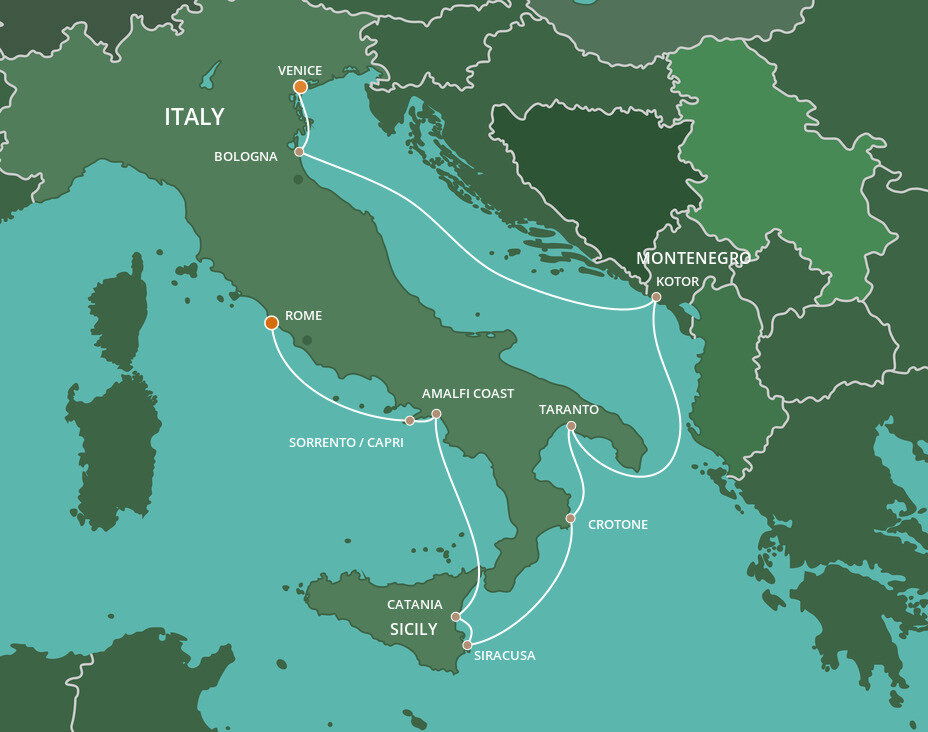 Tucked neatly under Italy’s heel, Taranto boasts a fascinating diversity of architectural styles due to the numerous invasions suffered by the city. A city of two distinct parts, the 'old city' is built on a small artificial island with a fascinating maze of narrow alleyways while the swankier 'new city' is replete with wide avenues. Ships will dock at the Port of Taranto.
