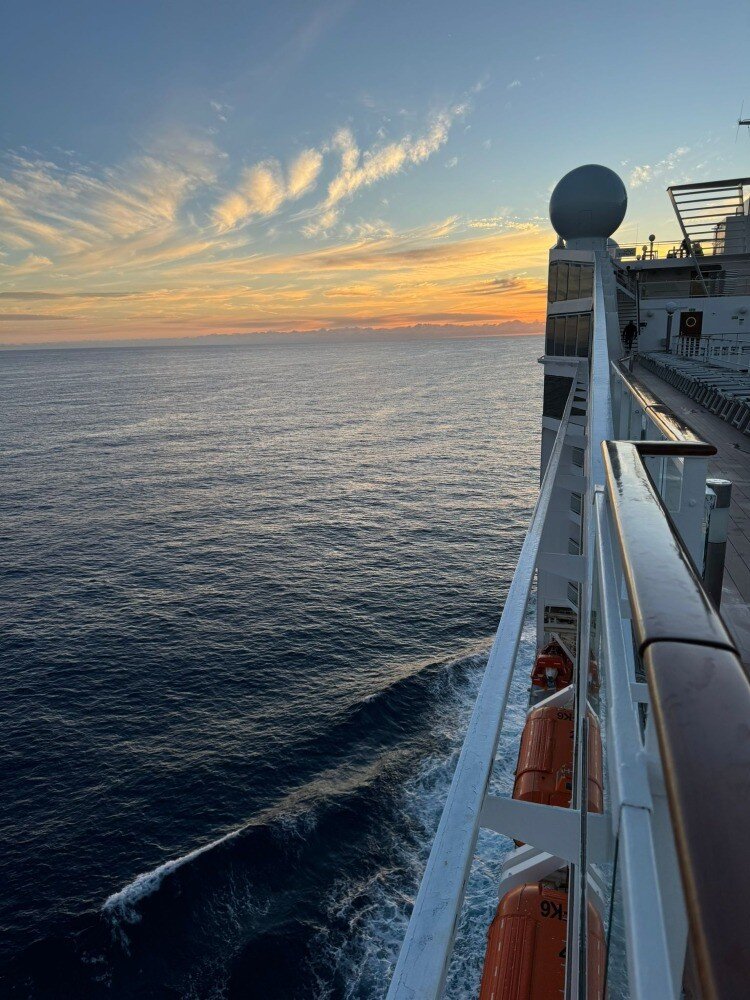 The Deluxe Balcony cabin has a surface of approximately 15 sqm, with a 5 sqm balcony, located on decks 8-9. It features a sitting area with a sofa and a bathroom with a shower, vanity area, and hairdryer. Comfortable double or single beds are available upon request. Amenities include an interactive TV, telephone, safe, minibar, and Wi-Fi connection (for a fee).