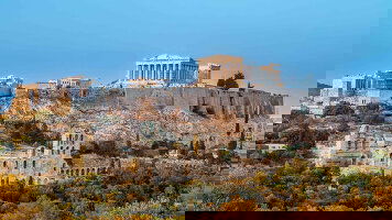 Admire the Parthenon, shining like a beacon over the Acropolis and the city below, its Pentelic marble columns glowing with a warm golden hue.