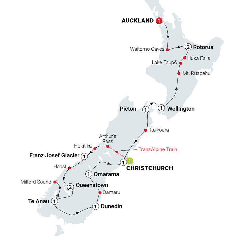 Jump aboard the TranzAlpine train bound for Christchurch, with panoramic views of snow-capped peaks, gorges and river valleys. Visit the small town of Hokitika, the heritage and cultural centre of the West Coast well-known for its jade. Around the corner is the town of Franz Josef, gateway to Franz Josef Glacier/Kā Roimata o Hine Hukatere. Get some perspective on an optional scenic flight. (B/D) Stay: Scenic Hotel Franz Josef Glacier