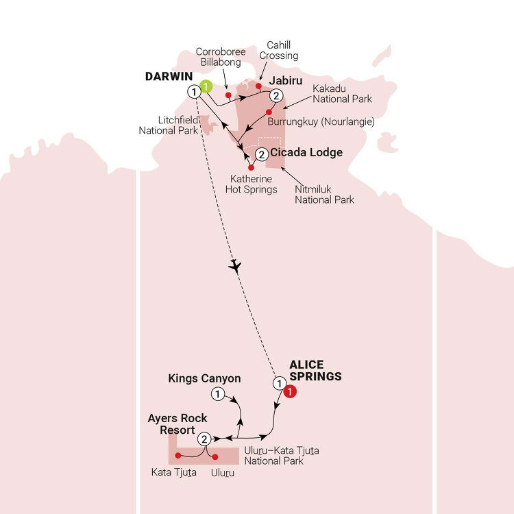 Begin your adventure from Alice Springs heading towards the majestic Kings Canyon. Along the way, stop at roadhouse at Erldunda, known as the "Centre of the Centre," where the Stuart and Lasseter Highways meet. Continue to Kings Canyon Resort, nestled in the heart of Watarrka National Park. This resort offers modern amenities, including a pool, restaurant, and comfortable deluxe lodge rooms.
