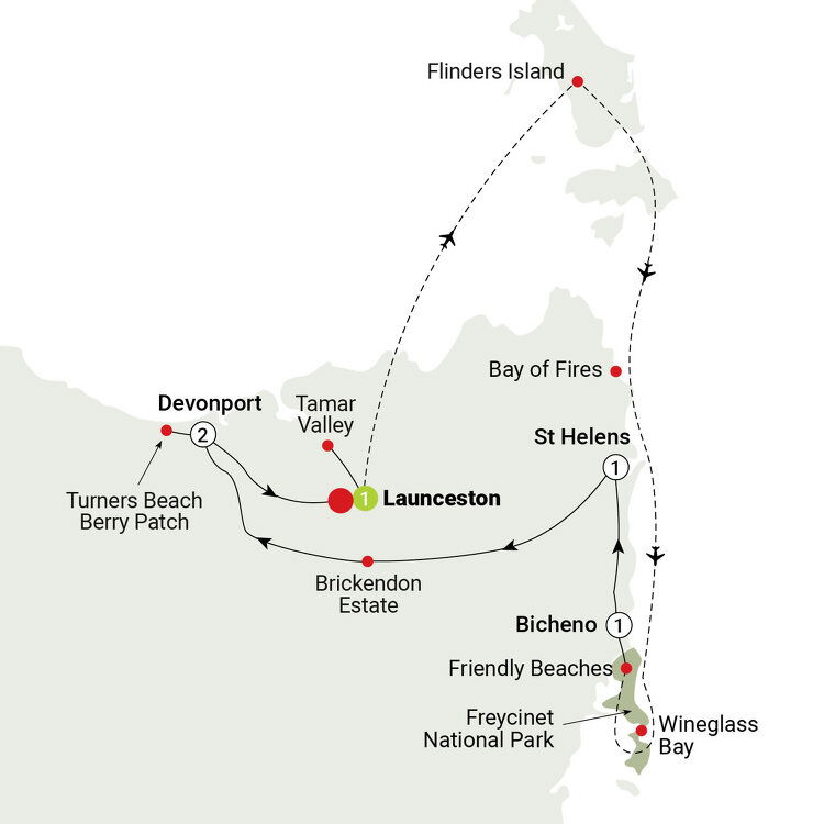 After lunch, you'll travel to Trousers Point in the Strzelecki National Park. Fly from Flinders Island down the east coast, passing over the stunning Bay of Fires and scenic Wineglass Bay before landing at Friendly Beaches before arriving at the quaint fishing village of Bicheno, your home for the night. (B/L) Stay: Beachfront at Bicheno