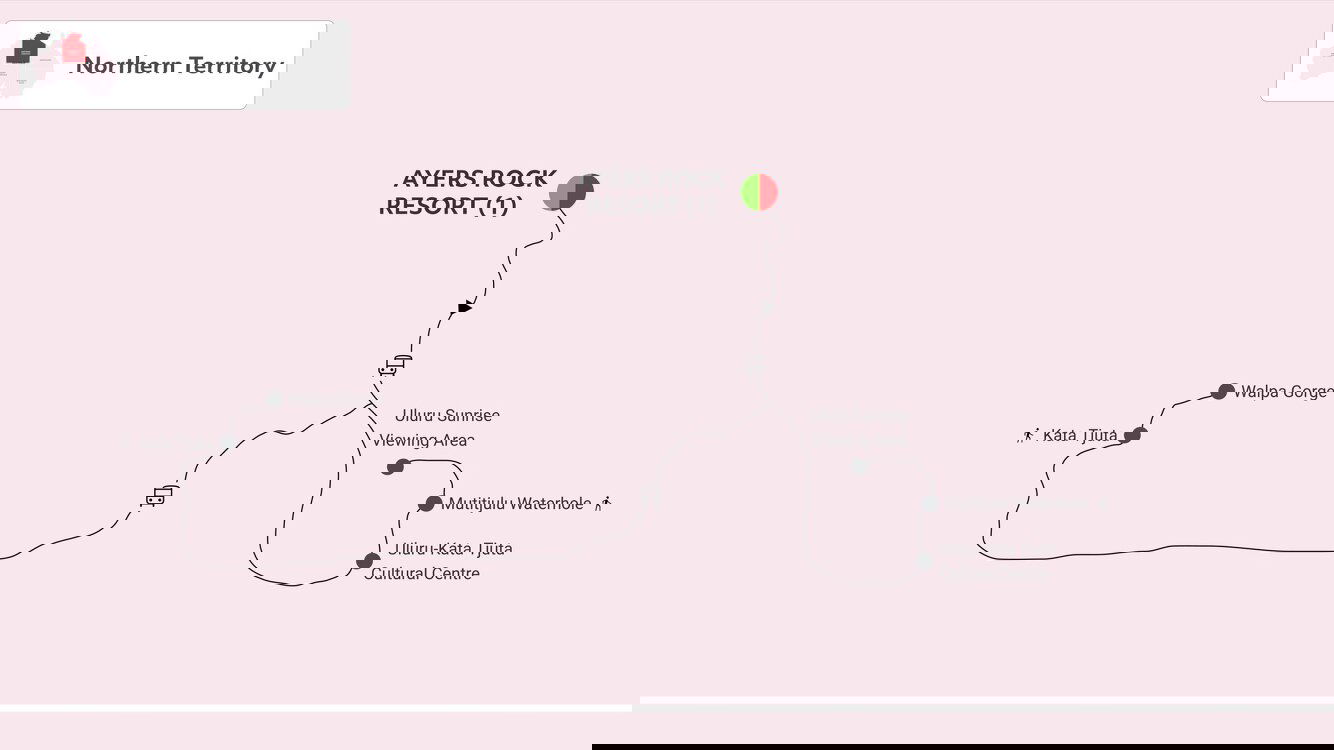 After sunrise travel to the mystical 36 domes of Kata Tjuta. On the way, enjoy panoramic views of the southern side of Kata Tjuta at a dune viewing platform before arriving at Walpa Gorge. Spend some time exploring the gorge and the unusual conglomerate rock formations. The 1.3km walking trail through Walpa Gorge follows the natural creek between two of the tallest domes of Kata Tjuta. Return to Ayers Rock Resort in time for lunch where your Short Break comes to an end.