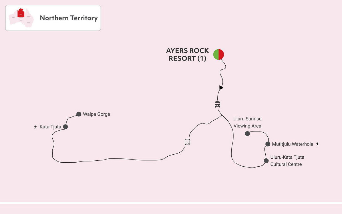 After sunrise travel to the mystical 36 domes of Kata Tjuta. On the way, enjoy panoramic views of the southern side of Kata Tjuta at a dune viewing platform before arriving at Walpa Gorge. Spend some time exploring the gorge and the unusual conglomerate rock formations. The 1.3km walking trail through Walpa Gorge follows the natural creek between two of the tallest domes of Kata Tjuta. Return to Ayers Rock Resort in time for lunch where your Short Break comes to an end.