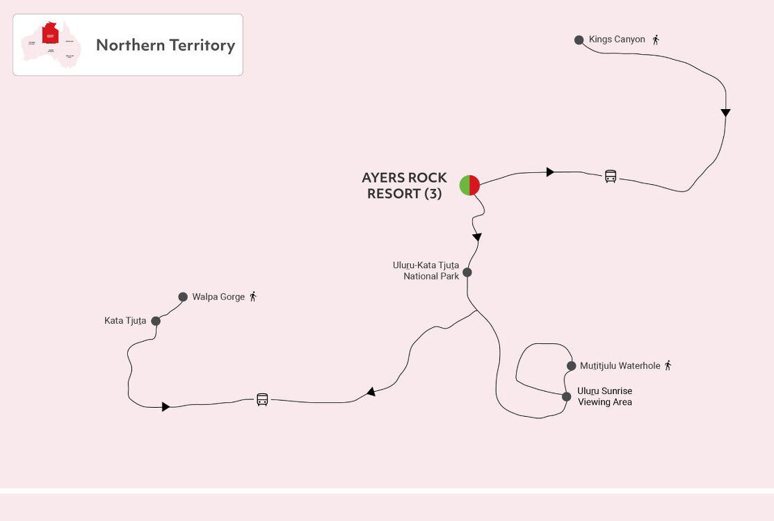 Rise early to travel to Talinguru Nyakunytjaku, the Uluru Sunrise Viewing Area. Watch the first rays of sun light up the desert while you enjoy a warming cup of tea or coffee. After sunrise travel to the mystical 36 domes of Kata Tjuta. On the way, enjoy panoramic views of the southern side of Kata Tjuta at the dune viewing platform before arriving at Walpa Gorge. Spend some time exploring the gorge and the unusual conglomerate rock formations. The 1.3km walking trail through Walpa Gorge follows the natural creek between two of the tallest domes of Kata Tjuta.