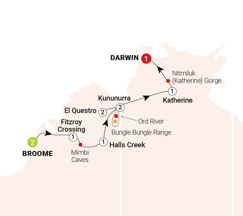 The best way to wake up? With the sun streaming through your tent, wildlife all around. Travel to Wyndham this morning, the most northerly township in Western Australia. Discover this small outback town and surrounding landforms and wetlands. When it's time to cool down, take a dip in the resort pool. Be back on your patio in time for sundowners. (B/D)