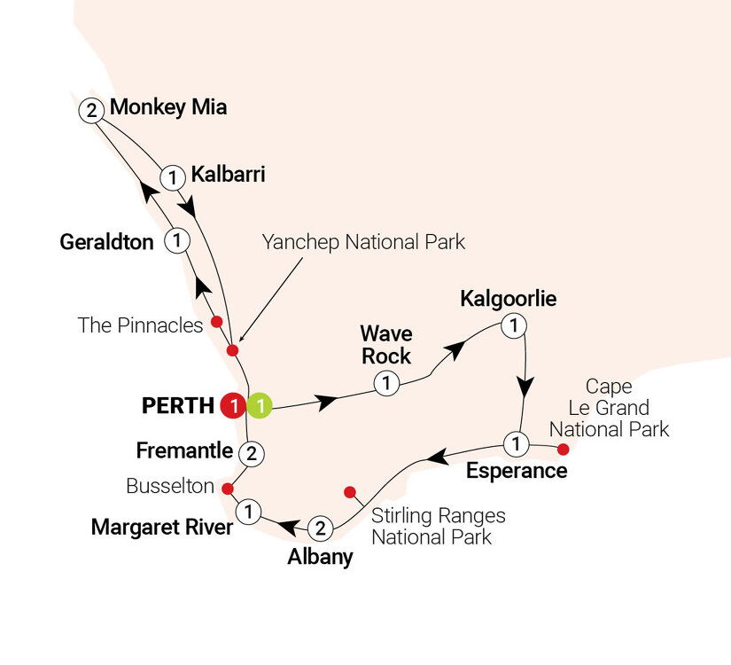 Just when you thought WA couldn't get any more colourful, Hutt Lagoon appears on the horizon – one of the state's pink lakes that changes its pink hues depending on the conditions. Arriving back in Perth you have dinner with your new friends and reminisce about the last two weeks. (B/D) Stay: Holiday Inn West Perth