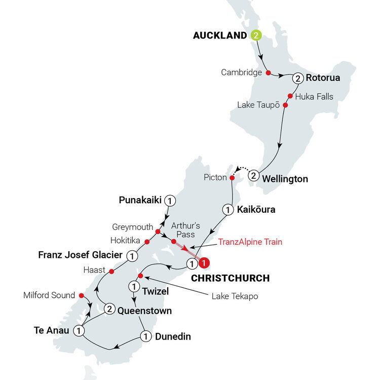 The best is yet to come – all aboard for the scenic TranzAlpine train back to Christchurch. Travel through tunnels and over viaducts, with panoramic views of snow-capped peaks, icy rivers, beech forests, gorges and river valleys. Your NZ tour arrives in Christchurch just in time for dinner. (B/L/D) Stay: Distinction Christchurch Hotel