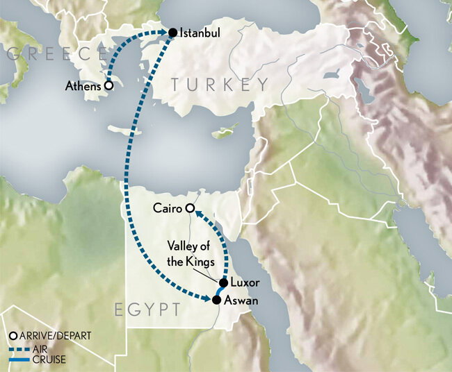 Today, bid farewell to Sanctuary Zein Nile Chateau, disembarking to fly aboard chartered aircraft to Cairo. Explore the Egyptian Museum of Antiquities to view a vast trove of artifacts including the treasures of King Tut's tomb. Then, check in at your hotel, located along Cairo's Corniche. Stay: Four Seasons Hotel Cairo at Nile Plaza (B/L)