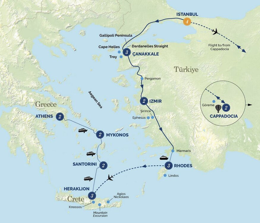 Sadly, your tour ends today after breakfast. A tour that encompasses the Cradles of Civilisation, hot air balloons, a unique Gallipoli campaign and 9 days hopping through 4 of Greece’s ionic islands. (B)