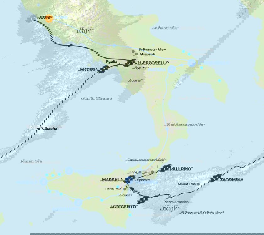 Driving across Calabria and down the toe of Italy we reach the Mediterranean, where we catch the ferry across the Straits of Messina to Sicily. Following the coast we arrive at the stunning town of Taormina where we stay the next four wonderful nights. (B/D) Stay: Excelsior Palace Hotel, Taormina