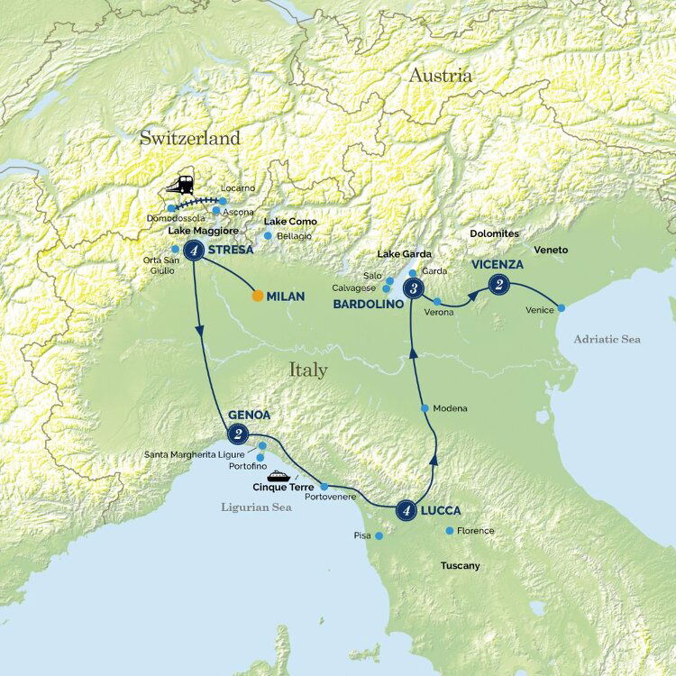 Boarding our private boat we visit Lake Maggiore's famous island of Isola Bella where we have included entrance and a guided tour of the palatial Borromeo villa and gardens, which dominate the island. The villa boasts Murano glass chandeliers, gobelin-covered chairs, intricate tapestries and paintings. The spectacular formal gardens rise behind the ornate villa, with patterned flower beds falling in terraces, with statues and ornamental stonework completing the Italianate style. Lunchtime is at leisure back in lakeside Stresa.