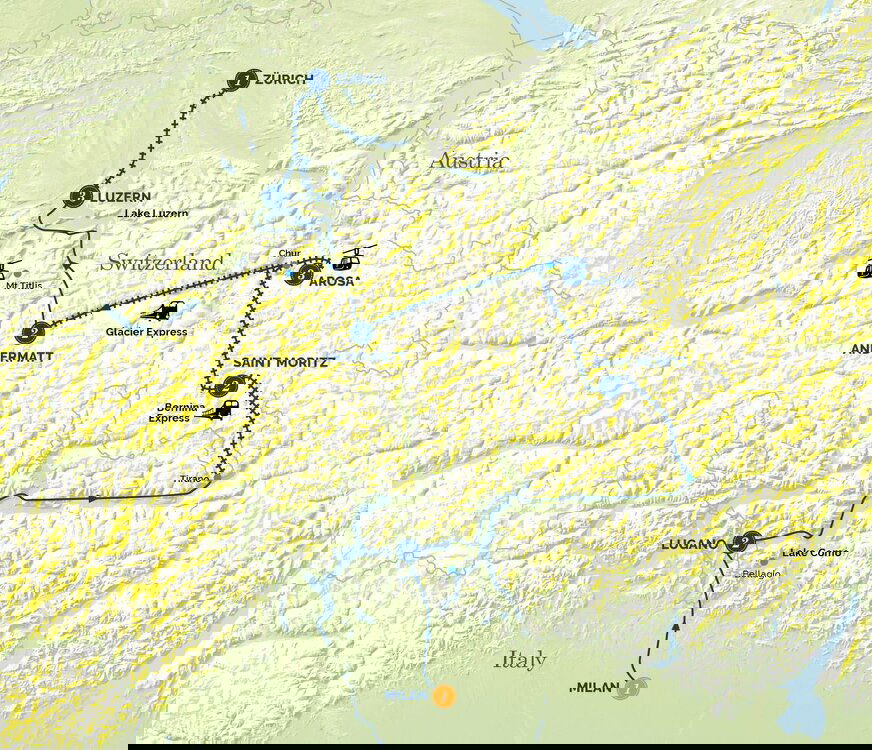 As the train winds its way up over the Brusio Circular Viaduct we head into the mountains past the three lakes of Lej Pitschen, Lej Nair and Lago Bianco. Mountains now soar either side and at the Montebello curve we have striking views of the Bernina massif, and the Morteratsch glacier. Mid afternoon we arrive at the chic ski resort town of St Moritz where we stay two nights. (B/D) Stay: Kulm Hotel, St Moritz, Switzerland
