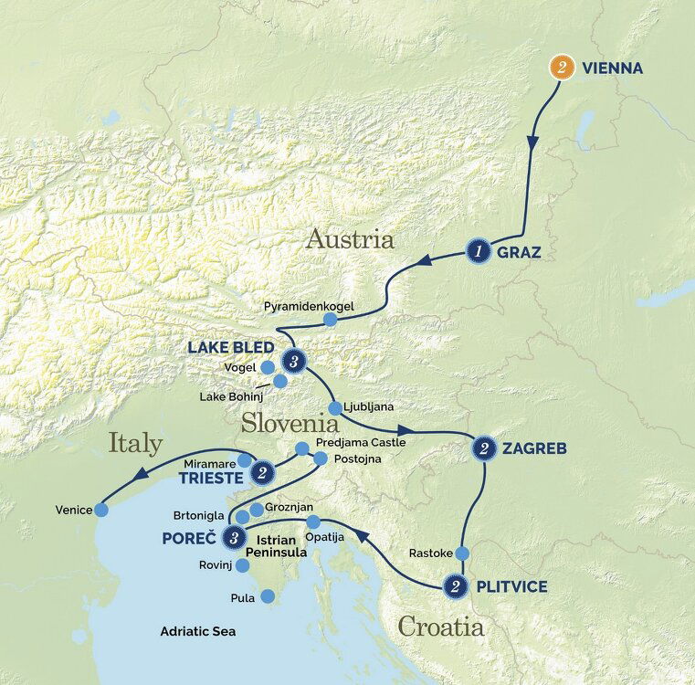 The first inhabitants here go back as far as prehistoric times, and here you will see the medieval castle and ruins of an ancient Roman basilica sitting next to a 14th century cathedral. Our last two nights will be here in Trieste, in a grand old-style hotel right on Trieste's waterfront. The main city square of Piazza Unità d'Italia (the Unity of Italy Square) is just one block away.