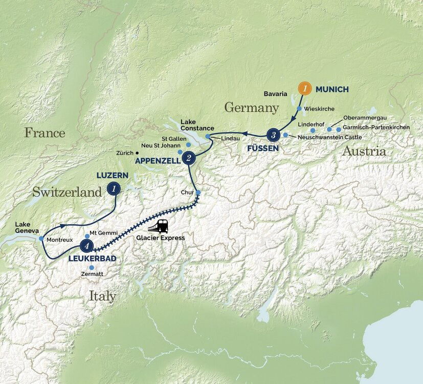 Late morning, we will enjoy a cable car ride up to the restaurant and panoramic terrace on Mount Gemmi. Here we have included a typical Swiss mountain lunch. Your afternoon and evening is free to explore Leukerbad town, enjoy the hotel’s spa, surrounded by massive mountains. (B/L/D) Stay: Le Bristol Wellness Hotel, Leukerbad
