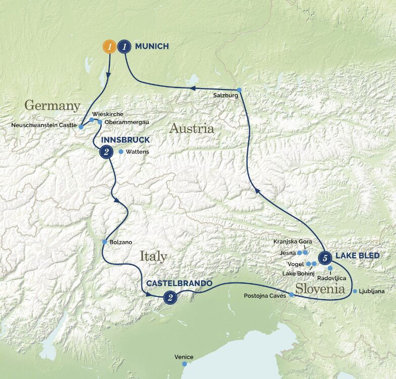 Continuing on, we arrive in the tiny village of Hohenschwangau nestled against a backdrop of the Bavarian Alps. What better way to spend the afternoon than a visit to the ‘fairytale' Neuschwanstein Castle! Perched high on a rocky spur, after an uphill walk you will enjoy a guided tour inside the King's apartments, staterooms, halls and throne room all reminiscent of a Wagner operatic saga.
