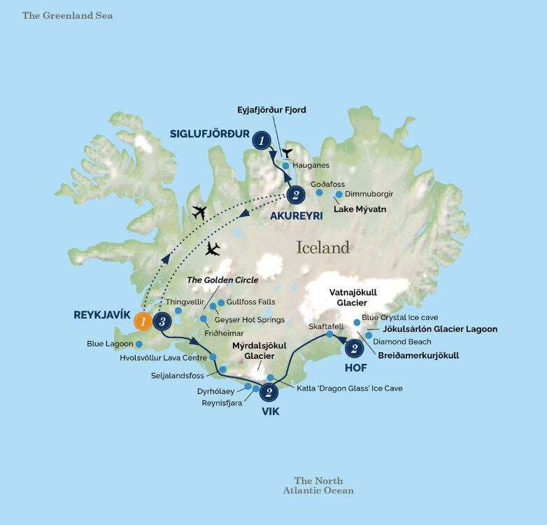 Our late morning flight takes us across Iceland’s frozen centre to the northern capital of Akureyri. From here we enjoy an incredible scenic drive alongside the Eyjafjörður Fjord, where steep mountain sides plunge straight down into the sea. Passing Dalvik we cut through the mountains to the small fishing town of Siglufjörður set beside its own peaceful fjord.