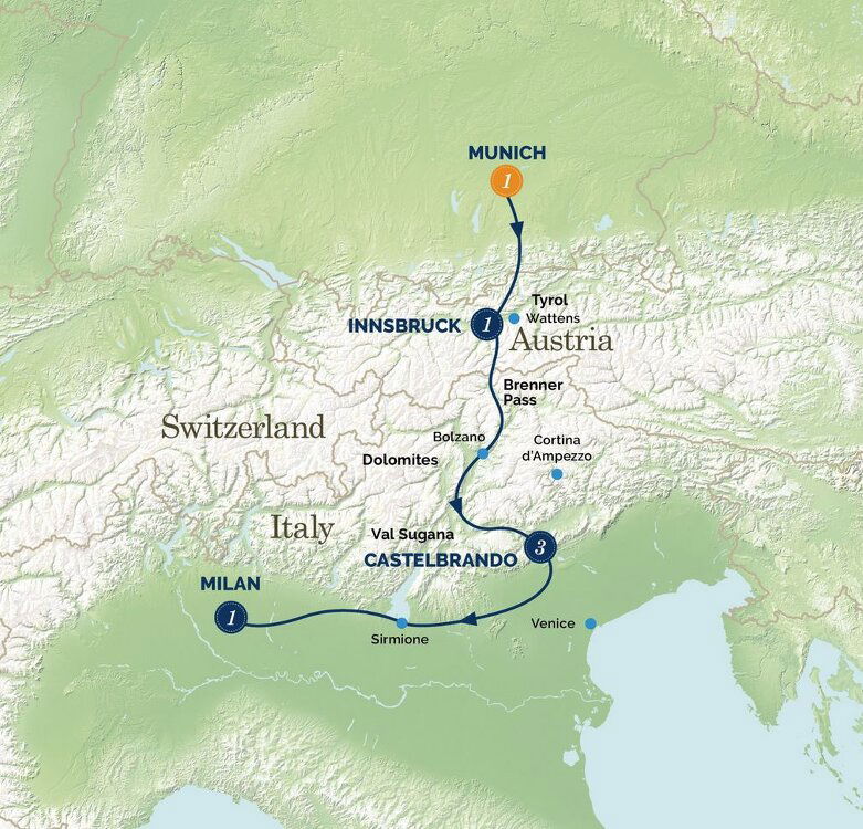 Today we cross into Italy via the Brenner Pass and visit Bolzano, capital of Alto Adige region. Intricately carved gables, painted timber façades and an elegant arcaded main street illustrate the influence of both Tyrolean and Italian cultures.