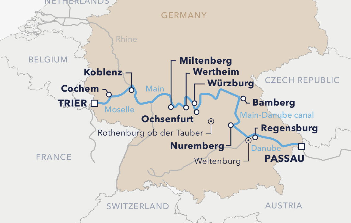 Ochsenfurt is your gateway to a thrilling morning excursion. Travel overland by bus to Rothenburg ob der Tauber, a remarkably preserved medieval town where the towers, city gates, walls, and half-timbered gables remain as they were centuries ago. After your tour, join the vessel for lunch in Würzburg, a Bavarian town known for its lavish Baroque and Rococo architecture.