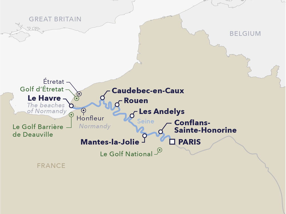 Arrive in Conflans, at the confluence of the Oise and the Seine Rivers. In the morning, you are transferred to the famous Le Golf National Club, which is situated southwest of Paris in Saint-Quentin-en-Yvelines, near the Palace of Versailles. At this legendary golf club you will be able to play the Aigle course, which is maintained at the same impeccable levels as its sister course, the Albatros. A delicious dinner awaits you back on board while your ship continues its journey down the Seine.