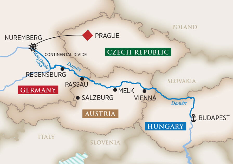 Enjoy a scenic morning cruise as the ship crosses the Continental Divide via the Main-Danube Canal to Nuremberg. Join a city tour of WWII highlights and then walk through Nuremberg's cobblestone streets to the Imperial Castle and 900-year-old city ramparts. Alternatively, you can taste your way through the city with a Franconian specialties tour, which introduces you to bratwurst, rotbier (red beer) and lebkuchen (gingerbread). Later, you can visit Nuremberg's Christkindlesmarkt, one of the world's largest and most famous Christmas markets. (B/L/D)