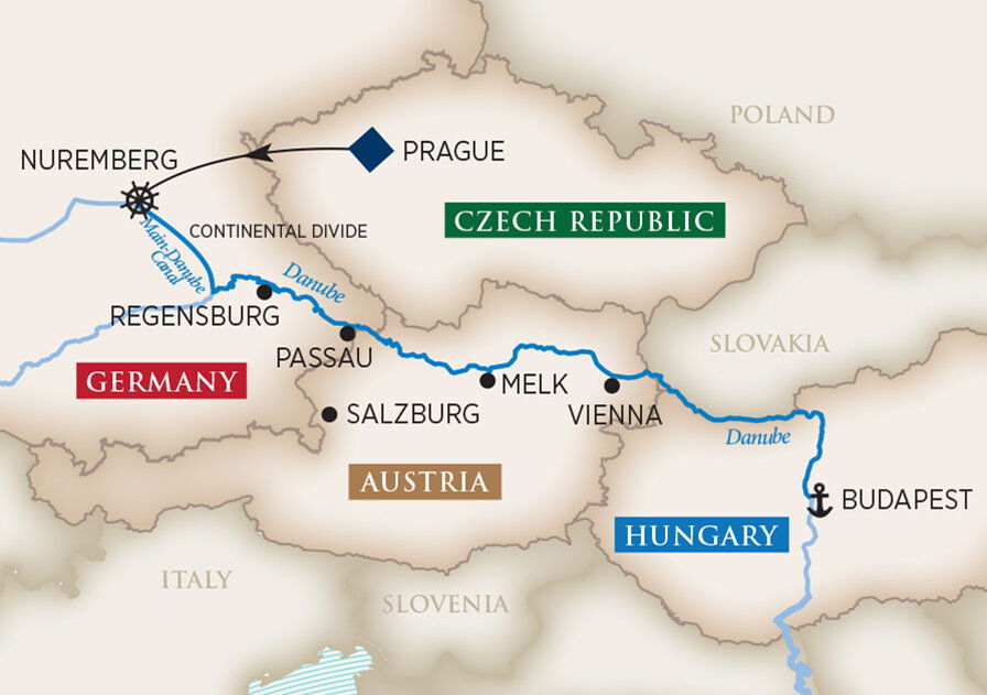 Join a city tour of WWII highlights and then walk through Nuremberg's cobblestone streets to the Imperial Castle and 900-year-old city ramparts, followed by a visit to Nuremberg's Christkindlesmarkt, one of the world's largest and most famous Christmas Markets. You can also choose to spend the entire morning exploring this iconic Christmas Market. For those looking for a taste of Nuremberg, depart for Nuremberg Imperial Castle and visit City Brewery where you will delight your palate with savory Nuremberg sausage and beer. Then continue to Sebalder Kirche (church) where you will nibble on sweet and spicy lebkuchen, a baked treat similar to gingerbread. End the day crossing the Continental Divide via the Main-Danube Canal. (B/L/D)