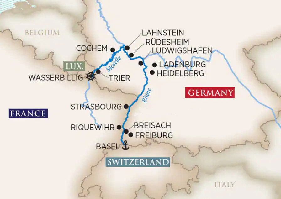 Wasserbillig is your gateway to Trier, Germany's oldest city, often referred to as the second Rome. Be guided to the Roman Imperial Baths, the Porta Nigra and Emperor Constantine's Throne Room. You can also cycle along the Moselle River past Trier's Imperial Baths, Porta Nigra city gate and other historic sites. As a final alternative, enjoy a lovely wine tasting in Luxembourg. (B/L/D)