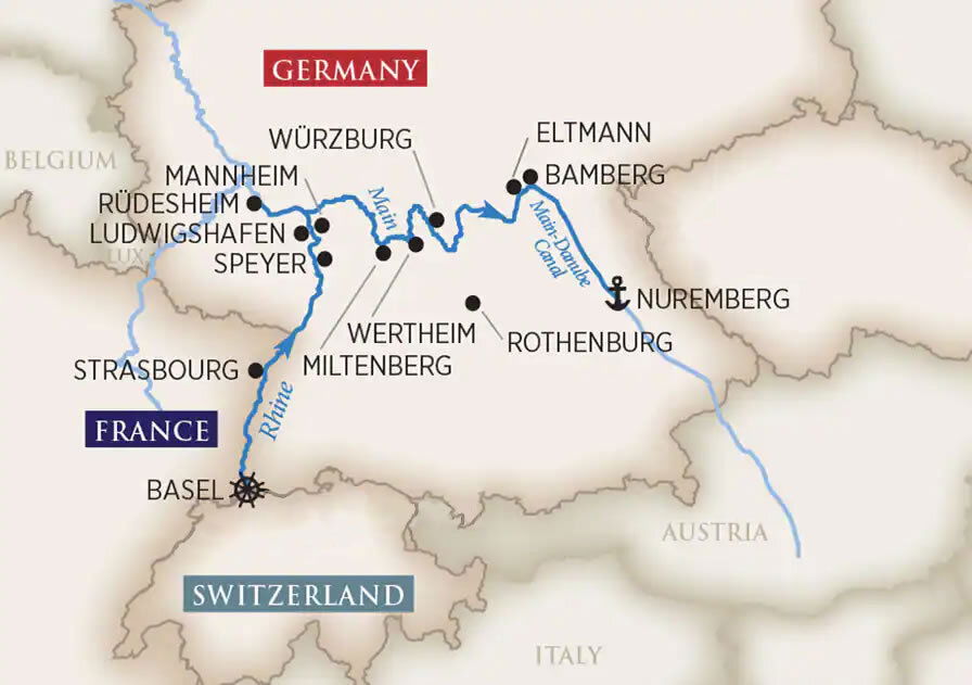 Board the ship in Basel for your Medieval Treasures cruise. (D)