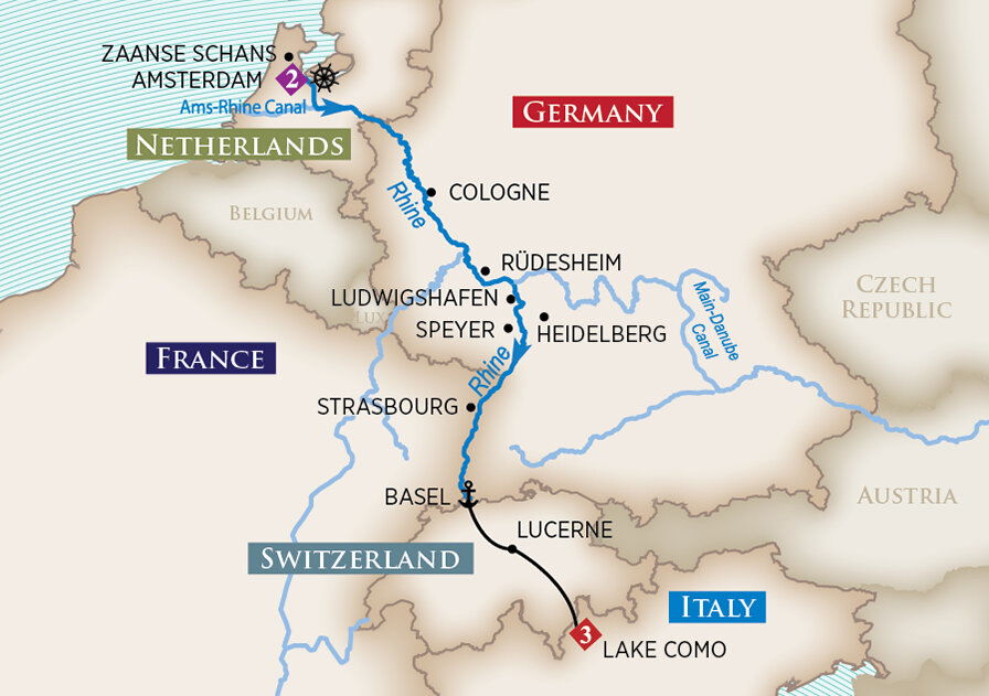 Embark your ship in Amsterdam for your Rhine Castles & Swiss Alps cruise. (D)