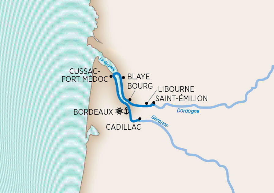 Just north of Bordeaux, the Garonne converges with the Dordogne River, forming the Gironde Estuary. Follow the Dordogne during a relaxing morning on the water, cruising between vineyards and villages to Libourne, the gateway to some of Bordeaux's most prestigious wine regions. Discover one of them on an excursion to the town of Saint Émilion, perched on a cliff overlooking an endless patchwork of vineyards. Here you'll tour an unusual church carved out of a single piece of limestone, and then descend beneath the church to discover its catacombs and caves.