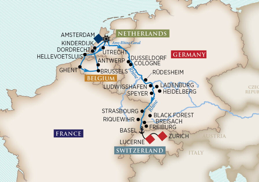 As a leading hub for German culture, commerce, and architecture, Düsseldorf is a must-visit city for any travelers on the Rhine. Here, you will have two options for the day's excursions. If you're feeling adventurous, take a brief trip to the nearby city of Cologne. Home to one of Germany's most revered Gothic masterpieces, the Cologne Cathedral, this 2,000-year-old city is also a bustling cosmopolitan hotspot. Join a guided tour through the enchanting Old Town and to the Cologne Rathaus, German's oldest town hall, the Old Market and the Heumarkt. Alternatively, explore historic Düsseldorf on foot with a knowledgeable local tour guide, then kick up your feet with a tasting of Altbier, a Düsseldorf specialty brewed using traditional techniques. (B/L/D)