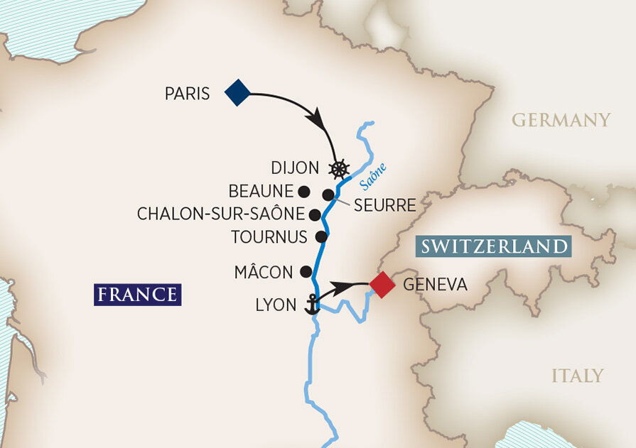 Famously known as the “Birthplace of Mustard,” Dijon was the home to the four Dukes of Burgundy from 1364 to 1477. On a guided tour, explore Dijon's medieval center which overflows with art and cultural heritage, showcased within several spectacular museums. Alternatively, visit the stunning Château d'Arcelot, with elements dating back to the 13th century. The Château d'Arcelot blends medieval religious structures, neoclassical architecture, and even a Chinese pavilion into a fascinating architectural marvel. Or embark on a guided bike tour along the Saône River and witness captivating sites such as the lock controlling the river's access to the Rhône-Rhine Canal. (B/L/D)