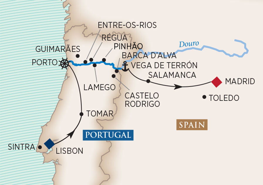 Venture to the town of Lamego, where you'll see the “Sanctuary of Our Lady of Remedies” on a city tour or climb the 686-step “Holy Staircase,” beautifully decorated with white and blue tiles, to the top on a guided hike. Whichever excursion you choose will conclude with a tasting of local specialties such as Bôlas de Lamego, bread filled with smoked ham; Presunto, a type of dry-cured ham; and Espumante, a Portuguese sparkling wine. Later in the day, cruise along the scenic Douro to Pinhão, where a wine tasting will be waiting for you in a local quinta. (B/L/D)