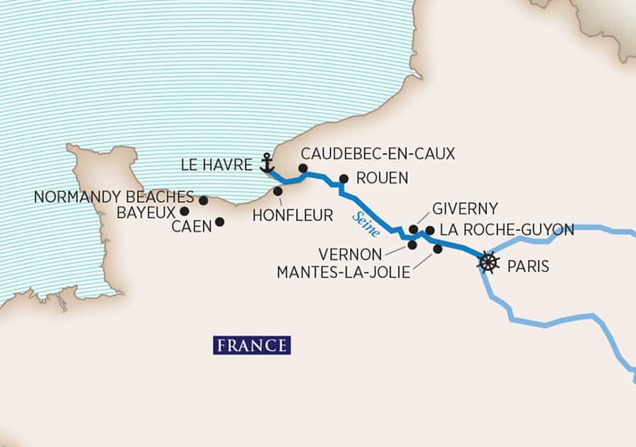 There are several different choices of excursions, both during the morning and afternoon, depending on your interests. You can choose between an excursion to the seaside town of Honfleur, renowned for its picturesque harbor, and for being an inspirational site for Impressionist painters. You can also choose a full-day excursion to see the historic Normandy Beaches, where you may visit such sites as the cemetery at Colleville-sur-Mer, Omaha Beach, the artillery battery at Longues-sur-Mer and the village of Arromanches, where the remains of the floating harbor used during the WWII landings can be seen.
