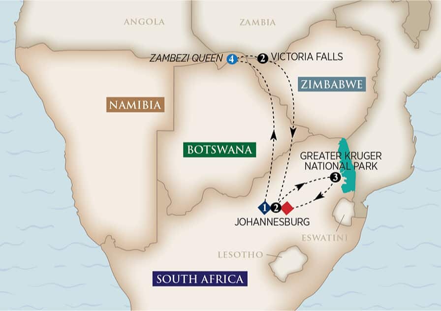 Enjoy a morning cruise during breakfast and be on the lookout for wildlife. Afterward, transfer to the legendary Victoria Falls, one of the world's greatest natural wonders. Spend the afternoon exploring the town or experience one of the many activities offered at your hotel. Later this afternoon, join a cocktail reception with appetizers aboard a vintage steam train and make your way to the Victoria Falls Bridge to watch the sunset over the Falls. (B)