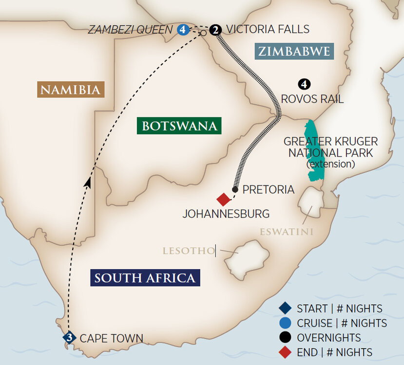 Enjoy a morning cruise during breakfast and be on the lookout for wildlife. Afterward, transfer to the legendary Victoria Falls, one of the world's greatest natural wonders. Spend the afternoon exploring the town or experience one of the many activities offered at your hotel. Later this afternoon, join a cocktail reception followed by dinner aboard a vintage steam train and make your way to the Victoria Falls Bridge to watch the sunset over the Falls. (B, D)