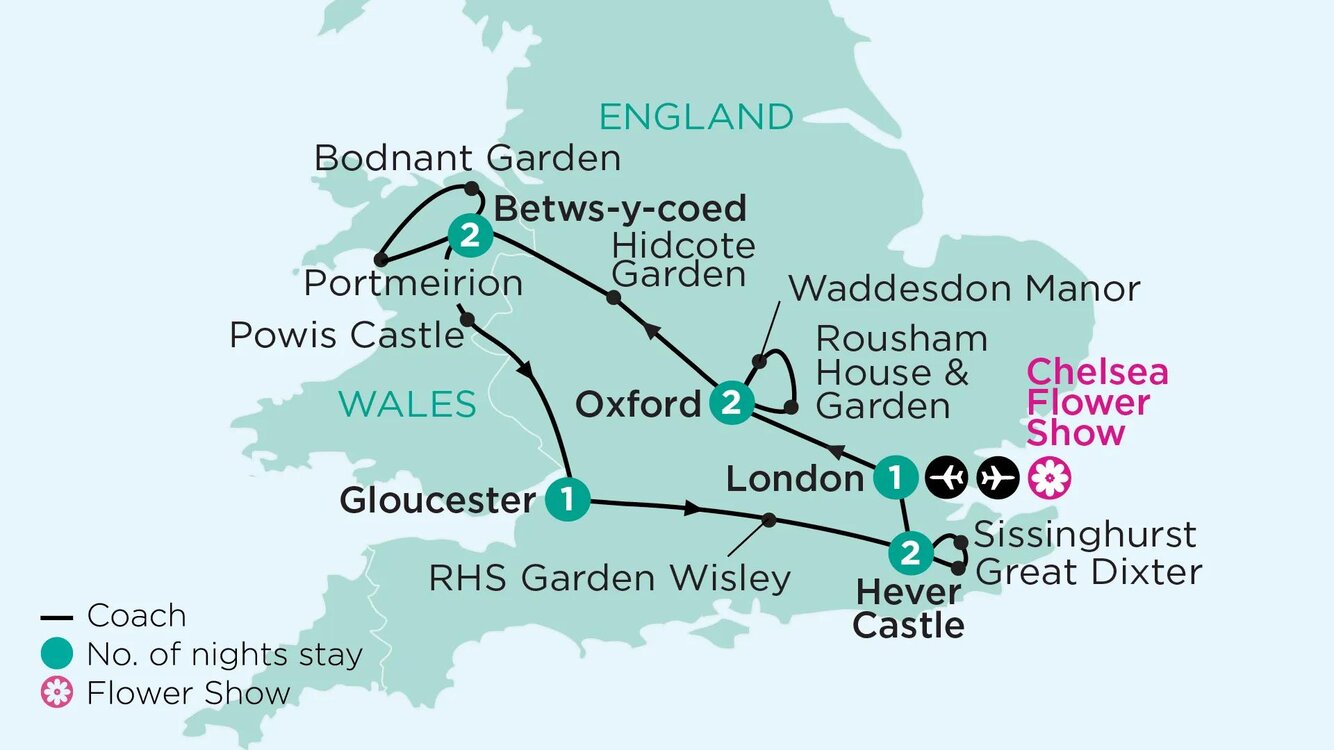 You will be met at the airport and transferred to your hotel. At 6.30 pm, enjoy dinner and a lecture about the Chelsea Flower Show by a leading garden designer. Stay: London, The May Fair Hotel or similar (D)