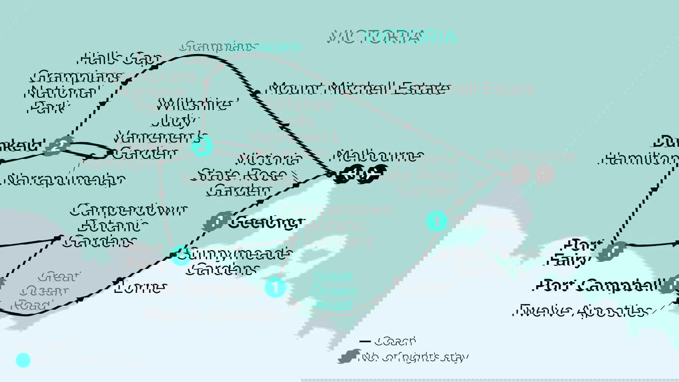 Visit a private garden just outside Geelong before heading to The Heights Heritage House and Garden. After lunch, we travel to the Victoria State Rose Garden in Werribee, to admire its massed blooms, before arriving back in Melbourne at approximately 4:00pm at the post-tour hotel. (B)