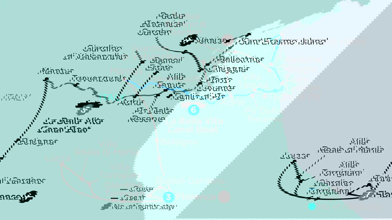 This morning we join the Bianco Canal, cruising to Adria, an ancient Etruscan town. Here, we visit the National Archaeological Museum. After lunch on board, we drive to the Bagnoli Estate to tour the Renaissance gardens and wine cellars of the 17th-century Villa Widmann Borletti and enjoy a private tasting of their renowned estate-grown vintages. We take a stroll around its vineyards, orchards and formal gardens with topiary and statues of theatrical characters. Afterwards, we rejoin La Bella Vita at its moorings in the town of Zelo, enjoying dinner on board. (B/L/D)