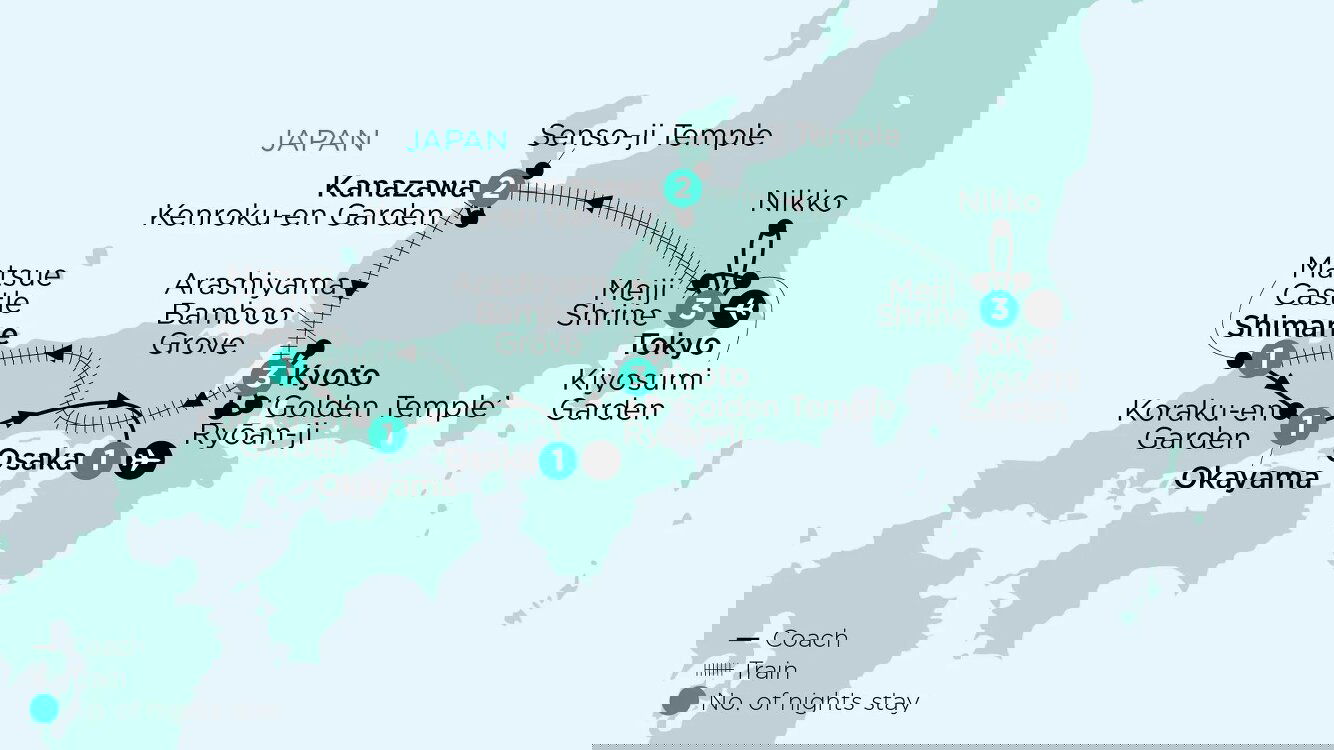 Today, we travel to the former capital of Nara to admire the imposing Todai-ji Temple, which was once the world's largest wooden structure. At Nara Park, we share the open green spaces with a large population of tame deer. From here, we head to Kasuga Taisha shrine, the Heian Shrine, whose garden represents those of the Meiji era. We round out our day with a visit to Ginkaku-ji Temple, the ‘Silver Pavilion', whose beautiful moss garden is complemented by a unique dry sand garden. (B/L)