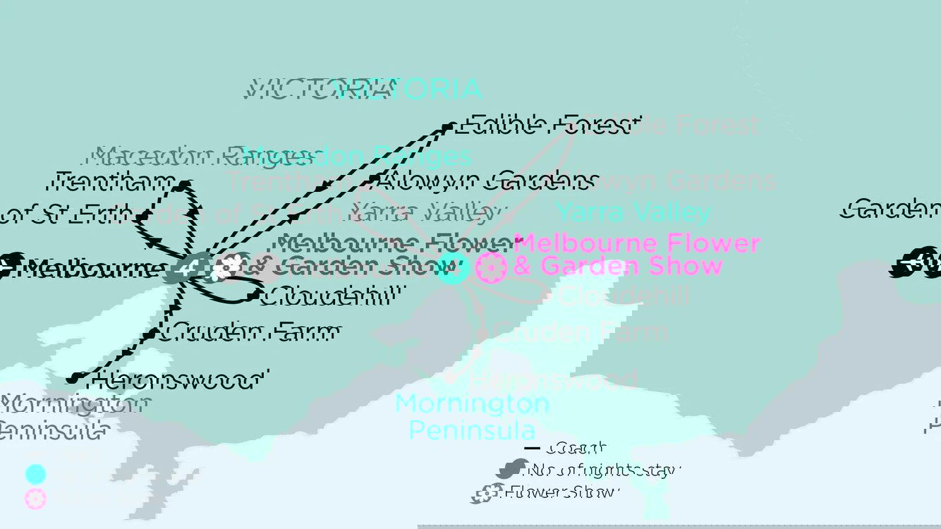Travel to the Yarra Valley to visit the Edible Forest. With over 300 plants growing within a one-acre forest garden, everything is either edible or medicinal. Then travel to Alowyn Gardens, a beautiful garden designed along strong symmetrical lines. Continue to Kinglake to visit Antique Perennials nursery and display garden, where you'll see hard-to-find perennials, bulbs, grasses and alpines. During dinner tonight, enjoy a special Melbourne Flower Show lecture by regular judge Teena Crawford. (B/D)