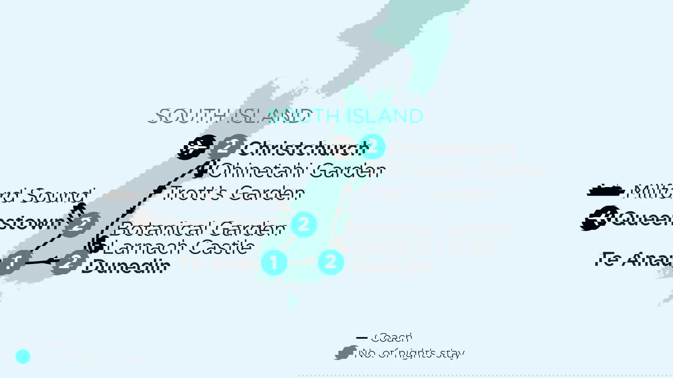 Today, look out for spring wildflowers as we make our way to Te Anau, in New Zealand's Southland region. We visit the garden of Castlemaine, which has a distinctive English influence, while being set within picturesque countryside. Here, we see a variety of hedges, roses and rhododendrons, and two small ponds. Stay: Te Anau, Distinction Hotel and Villas or similar (B/D)