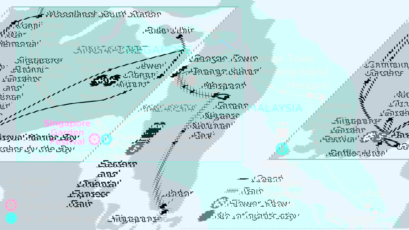 Discover the many creative and varied displays on show at the renowned Singapore Garden Festival today. Garden designers from around the world come to showcase their masterpieces at the event, which is only held once every two years. Then bid farewell to your Botanical Guide and board the striking green and cream carriages of the Eastern & Oriental Express at Woodlands Station, Singapore.