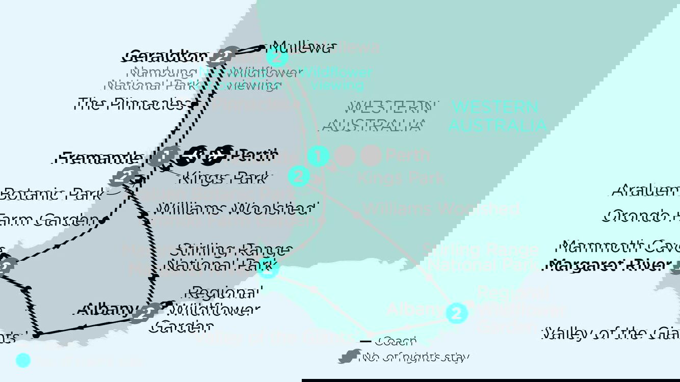 Meet your Botanical Guide and fellow travellers at your Perth hotel. This afternoon, explore Kings Park which features 400 hectares of delightful gardens, parklands, native bushland, and a spectacular display of more than 1,700 native wildflower species during spring. This evening, enjoy a Welcome Dinner at your hotel. Stay: Perth, Pan Pacific or similar (D)