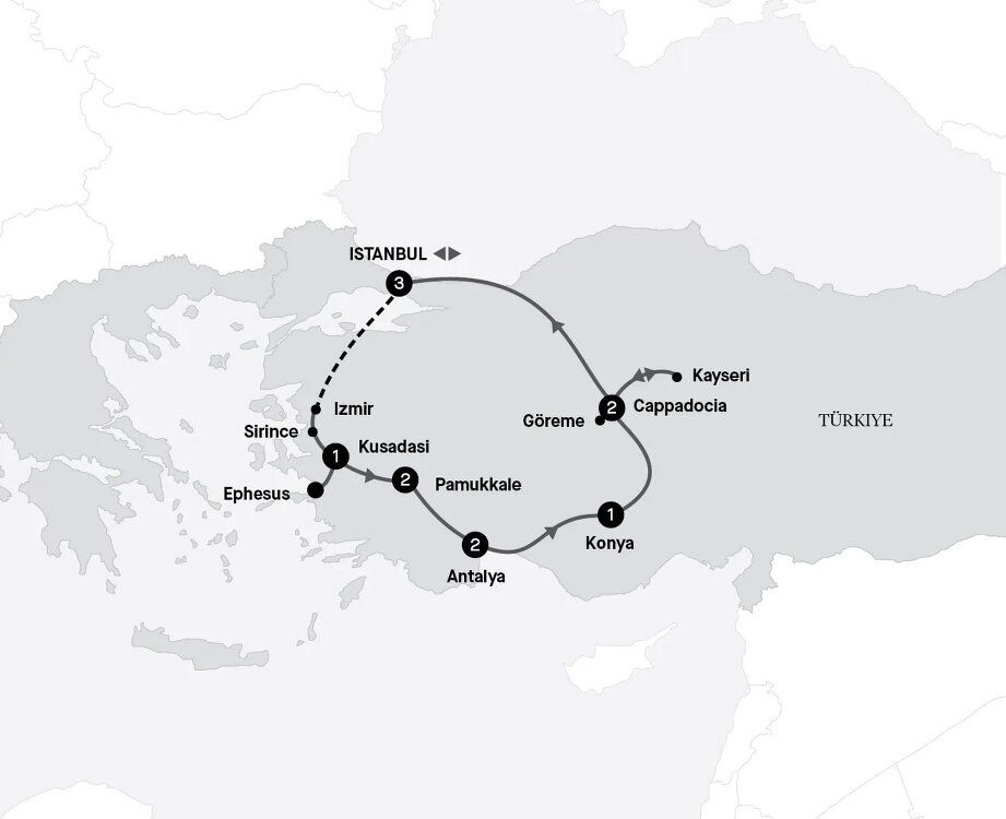 This morning, take an included flight to Izmir. On arrival, drive an hour south to the former Greek village of Şirince. Surrounded by rolling mountains, the village is famous for its wine and olive oil production. Savour a wine tasting, then continue to the Çamlık Steam Locomotive Museum, located on the former ORC mainline, the oldest railway line in Türkiye. The open-air museum is home to a fascinating collection of more than 30 steam locomotives from around the world. Afterwards, drive to Kuşadası, where you'll enjoy dinner and stay tonight. Stay: Elite World Kuşadası (B/L/D)