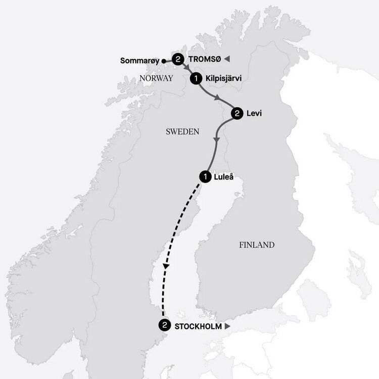 Venture into the pristine wilderness with a visit to a husky farm. Embark on an exhilarating sled ride through snow-covered mountains and serene forest landscapes, then savour lunch on the farm. Afterwards, cross the border into Finland and conclude the day with a relaxing dinner at your hotel. Stay: Kilpisjärvi, Santa's Hotel Rakka (B/L/D)