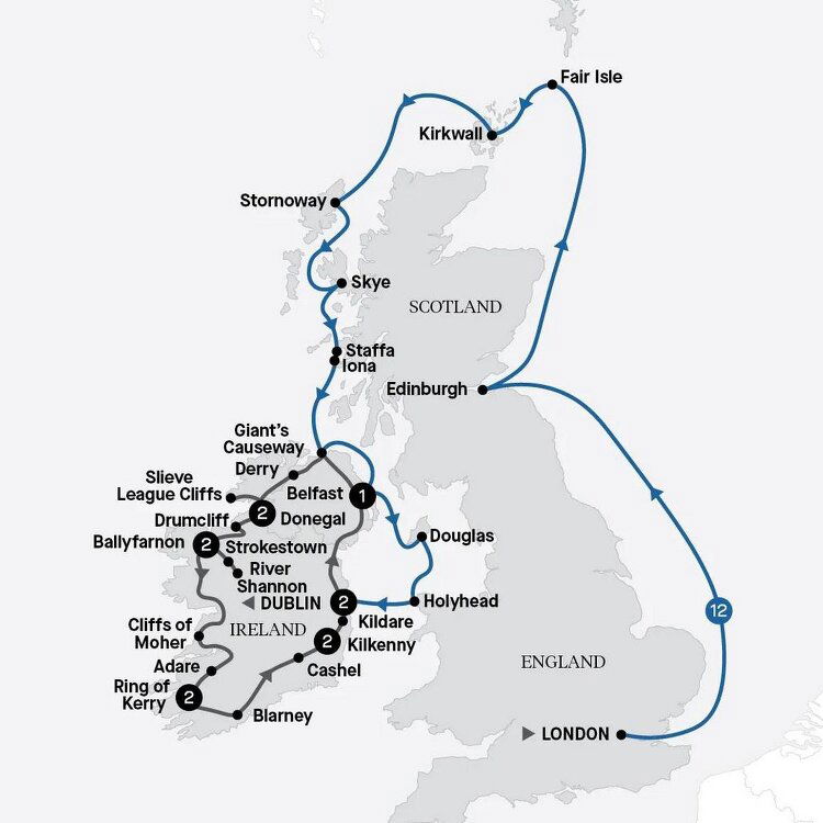 Arrive in Douglas, the capital of the extraordinary Isle of Man, known for its stunning natural beauty and fascinating history. Choose how to explore today with an included sightseeing activity. (B/L/D)
