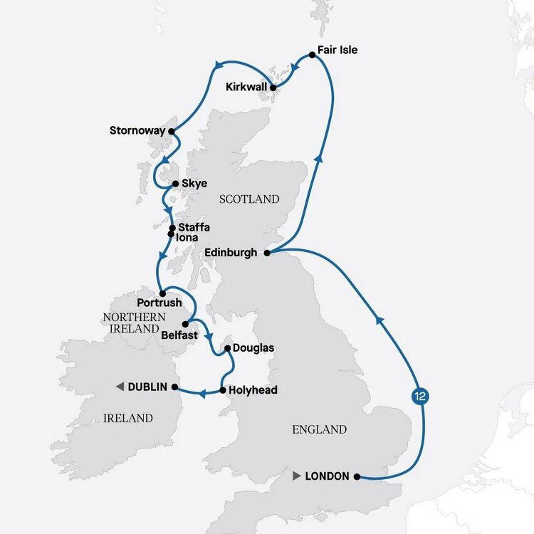 Arrive in Douglas, the capital of the extraordinary Isle of Man, known for its stunning natural beauty and fascinating history. Choose how to explore today with an included sightseeing activity. (B/L/D)