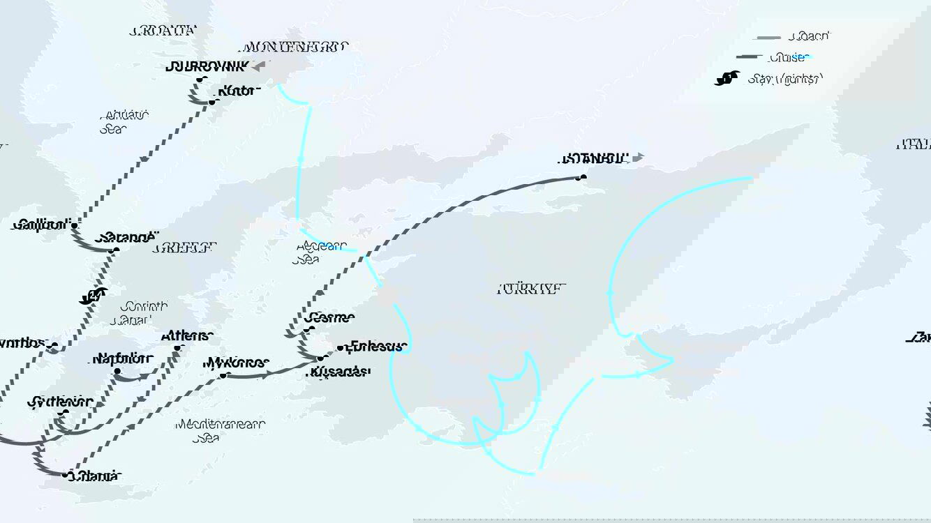 Arrive in the ancient capital of Athens and embark on a tour of the city's most popular sites including the legendary Acropolis, the Parthenon, and the historic neighbourhood of Plaka. Step back in time as you walk through the narrow, cobblestone streets that the Ancient Greeks once called home. (B/L/D)