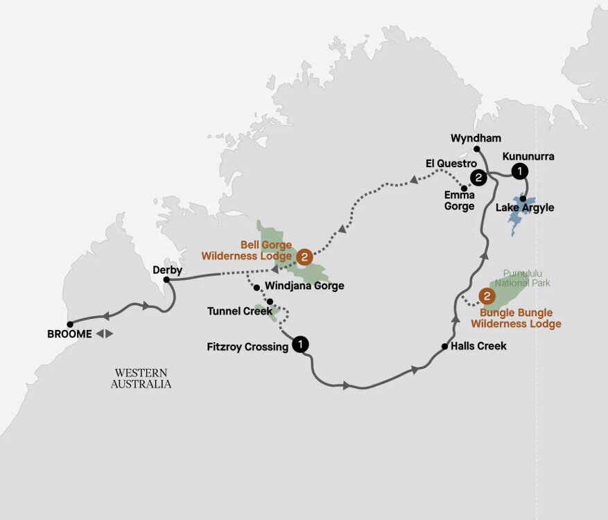 Back on the Gibb River Road, travel to Bell Gorge, where spectacular cliffs surround a series of tiered waterholes. Should you be feeling particularly energetic, you may take the opportunity to hike to the lower pool of the gorge and enjoy a relaxing dip below the cascading waterfall. (B/L/D)